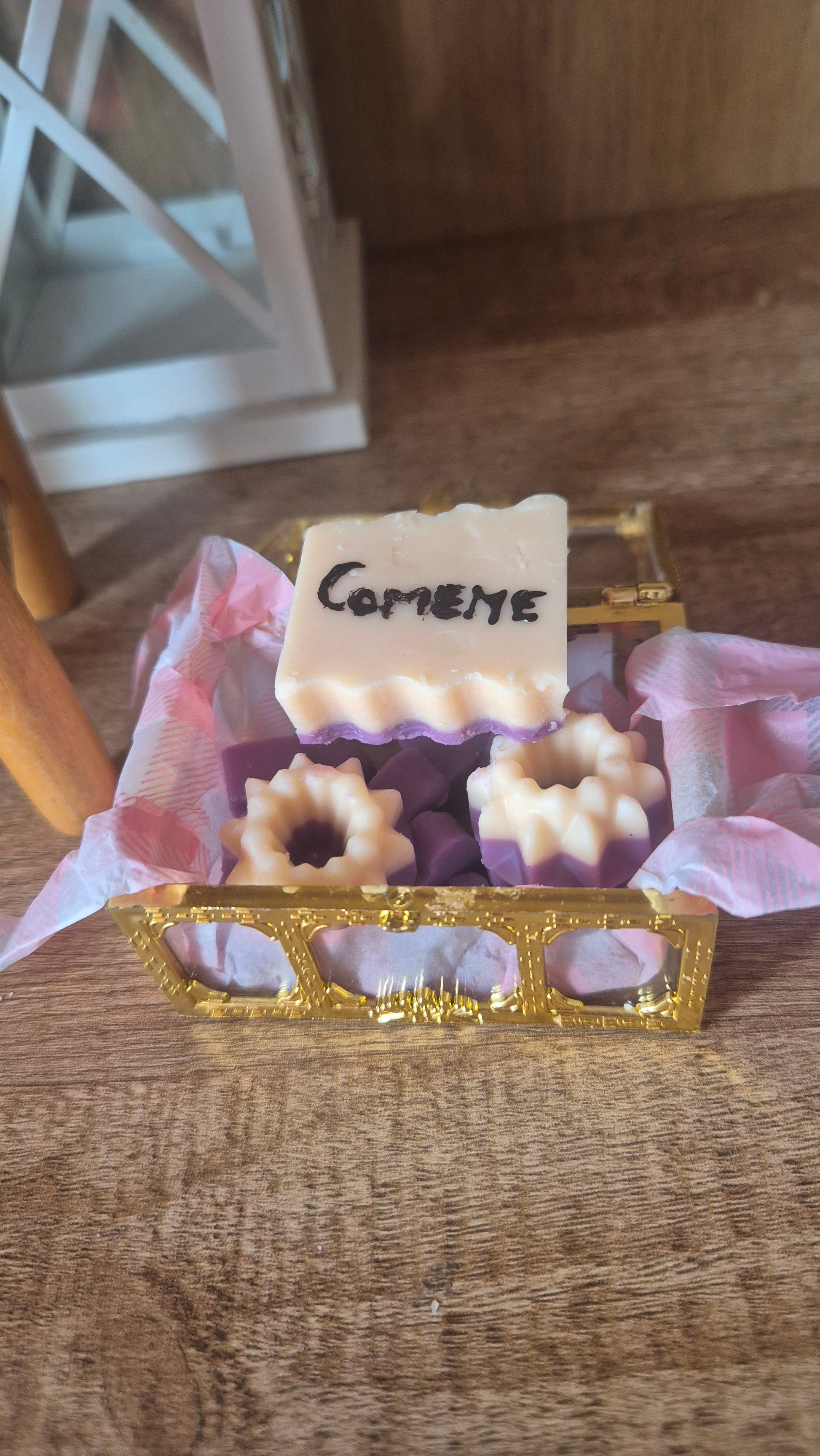 📦 Formato: 2 figuras de bizcocho otro mas con la palabra comemem y corazónes morados dentro de un cofre encantado