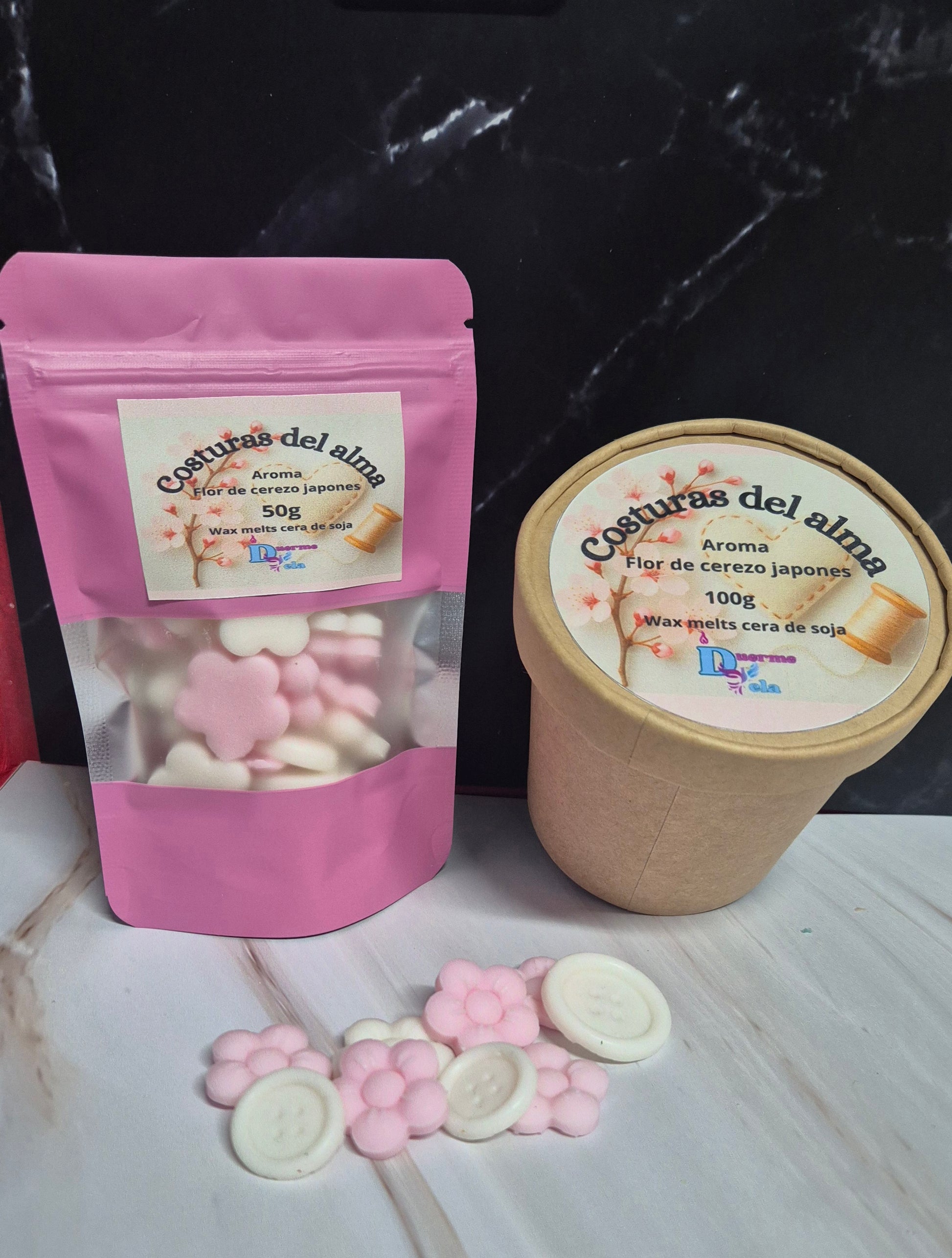 Cada waxmelt lleva pequeños botones y flores de cerezo como si fueran retales de una historia que se cose con cariño.
